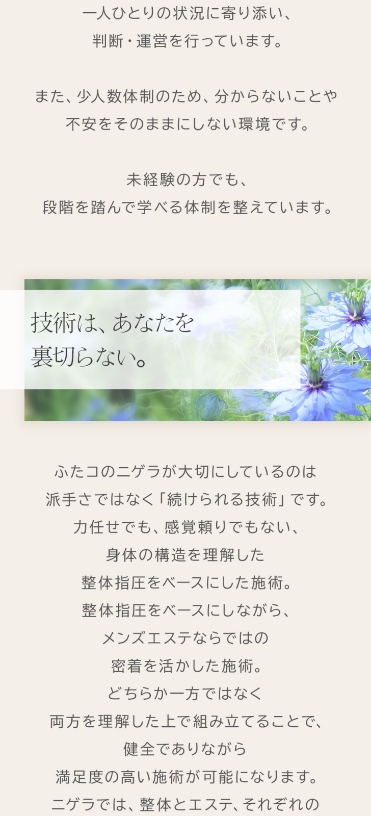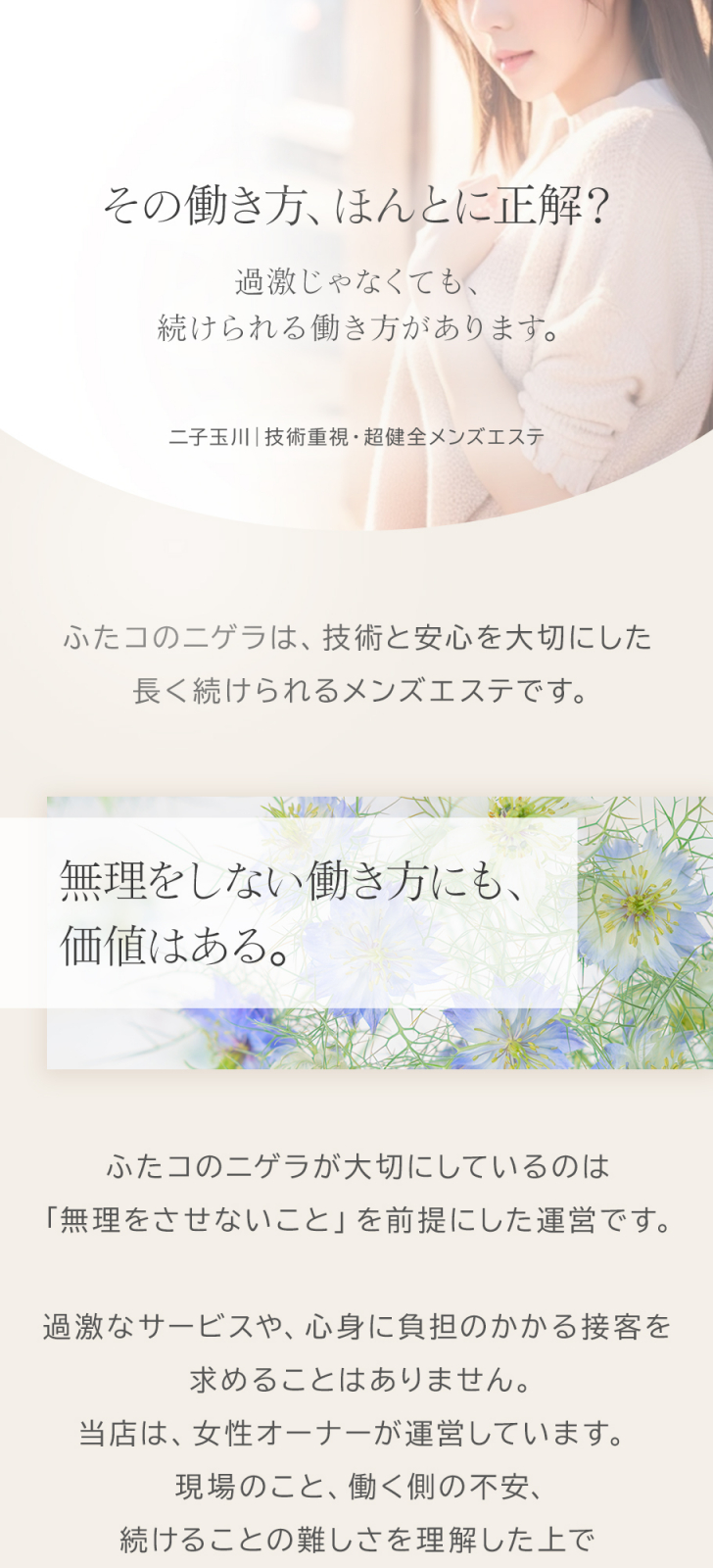 | 当店について | 二子玉川の完全個室メンズエステ《ふたコのニゲラ》。花言葉“幻想”を宿す名の通り、二子玉川で技術力にこだわった本格オイルトリートメントを追求。ここにしかない安心感と、帰り道に思わず立ち寄りたくなる静かな余韻が特徴。技術で選ばれる二子玉川の大人の隠れ家サロンです。 |