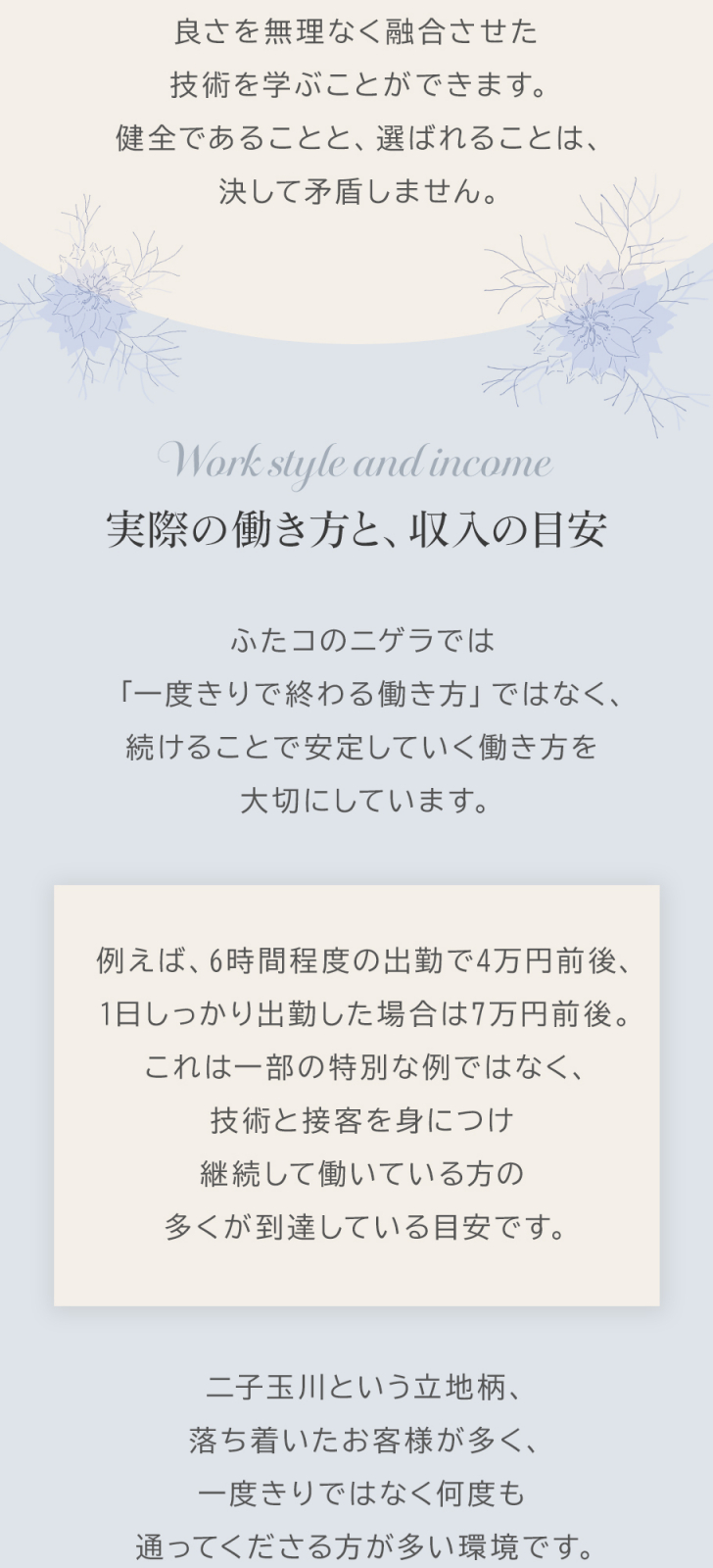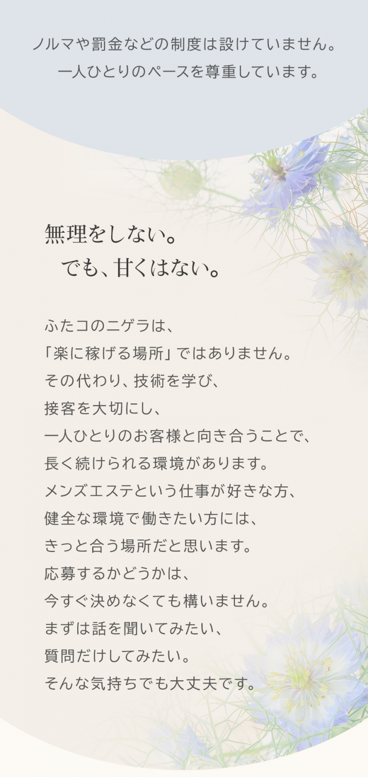 | メッセージ | 【ニゲラの重視するポイント】 ニゲラが大切にするのは、『お客様の心に寄りそい、温かい癒しを"最高級のおもてなし"でお届けすること』です。そしてそれは、ニゲラで働く新たなセラピストの皆様に対しても同様です。 お客様の見えるもの、触れるもの、伝わるもの全てに「人気があり信頼されているブランド」を惜しみなく導入し、セラピストさん自身も、自分に自信を持って働ける環境を整えています。 勿論、細部にまでその拘りを行き届かせ、ニゲラを唯一無二の空間を作り出す店舗として運営してまいります。 ぜひ、共に素敵な場所を作っていきましょうね✨ |