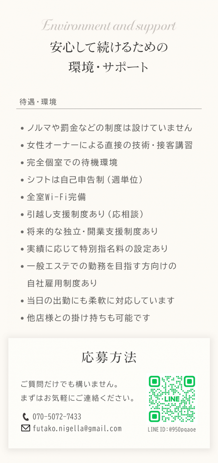 | 待遇 | 🌟ニゲラの魅力は豊富 🌟 💖 常連のお客様多数! 安定して働ける安心感✨ 💆♀️ 女性オーナー運営! 現場を知る女性目線でサポート🌸 📚 講習受け放題! 未経験も経験者もスキルUPし放題🔥 💰 高バック率を実現! 頑張った分がそのまま収入に💎 ⏰ 自由シフト制! 学校や家庭との両立もOK🙆♀️ 🛡️ 顧問弁護士契約あり! トラブル時も安心サポート👌 💆♀️ 高級アイテム多数完備! ✨【Refa(リファ)】の最新ドライヤー・ヘアアイロン 美容サロンやSNSでも大人気💖 “髪が本当にツヤツヤになる”と評判の必須アイテムを自由に使えます! 🧴【Refa(リファ)】のボディソープ・ヘアシャンプー・トリートメント 香りや使用感にこだわった高級ライン。 サロン後のリフレッシュタイムも贅沢に楽しめます✨ 🌿【N organic(エヌオーガニック)】のハンドソープ&アメニティ 雑誌やSNSで「香りが最高」「手肌に優しい」と大人気💖 手を洗うたびに癒される上質な香りで、毎日の勤務がもっと心地よく。 🛋️ 高級タオルやアロマオイルなど、細部までこだわった備品も充実✨ 【働きやすさを追求】 ①手ぶら出勤OK!必要なものはすべて完備 ②美しいシルエットが映えるヨガウェアをご用意 ③清潔で落ち着いたルーム環境 「高級スパ並みの環境で働ける」というイメージを作り上げます✨ |